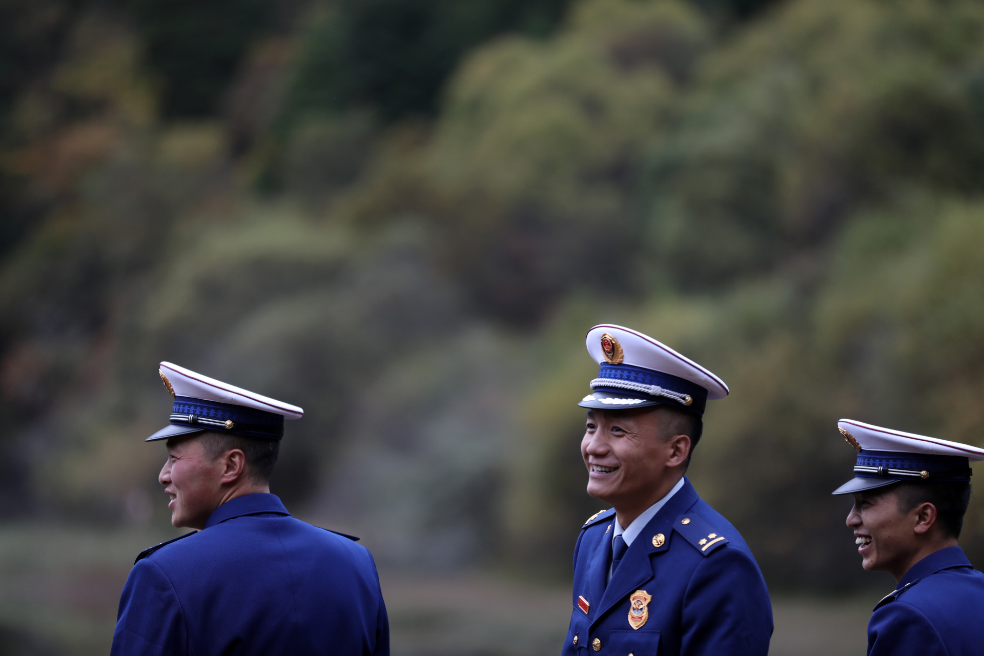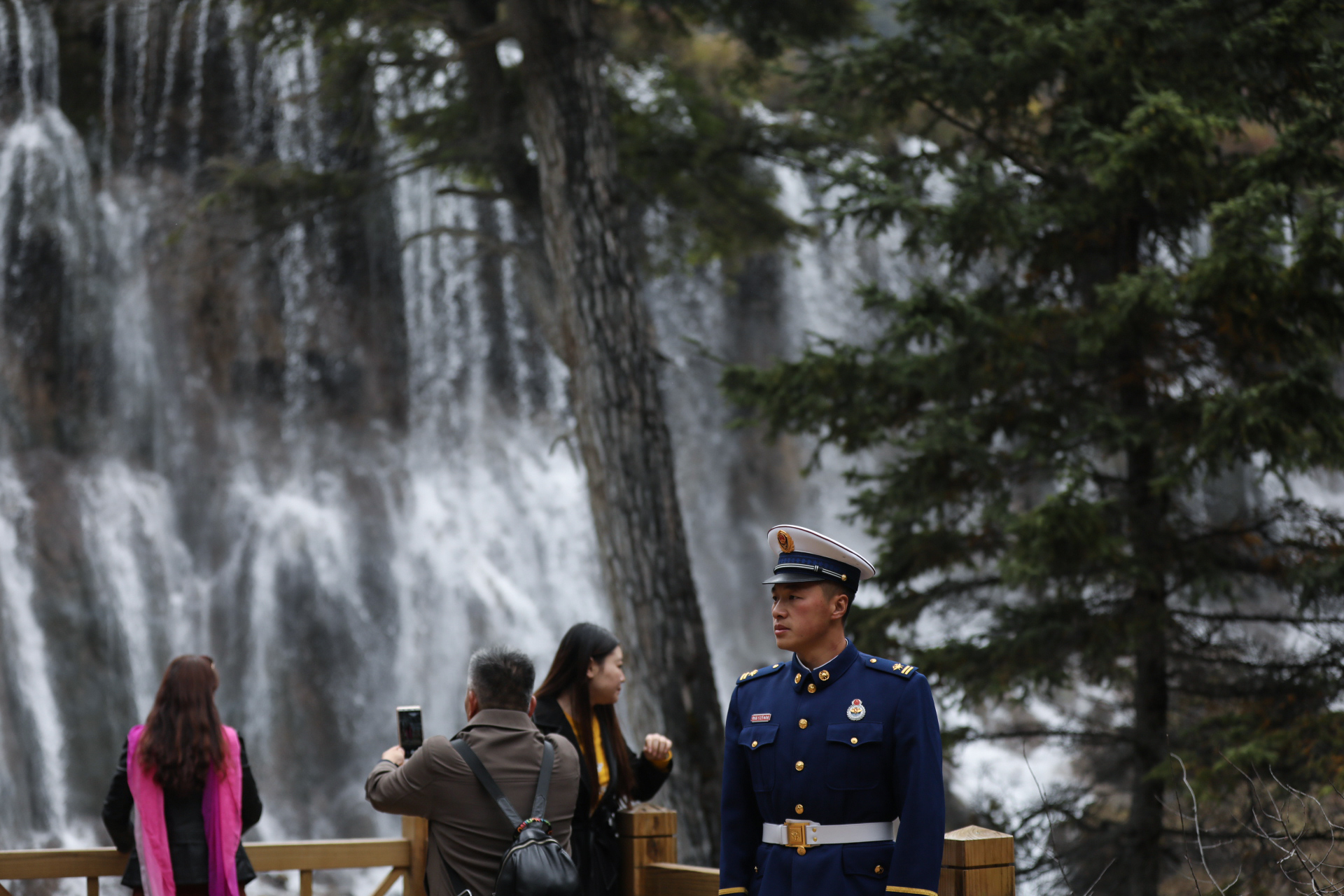 廖海州和中隊長倪磊并肩巡邏在五花海景點的棧道上,“前年地震,我們從這里抬出來了好幾個受傷游客.....”這對同年入伍的老隊員 最能聊到一起。