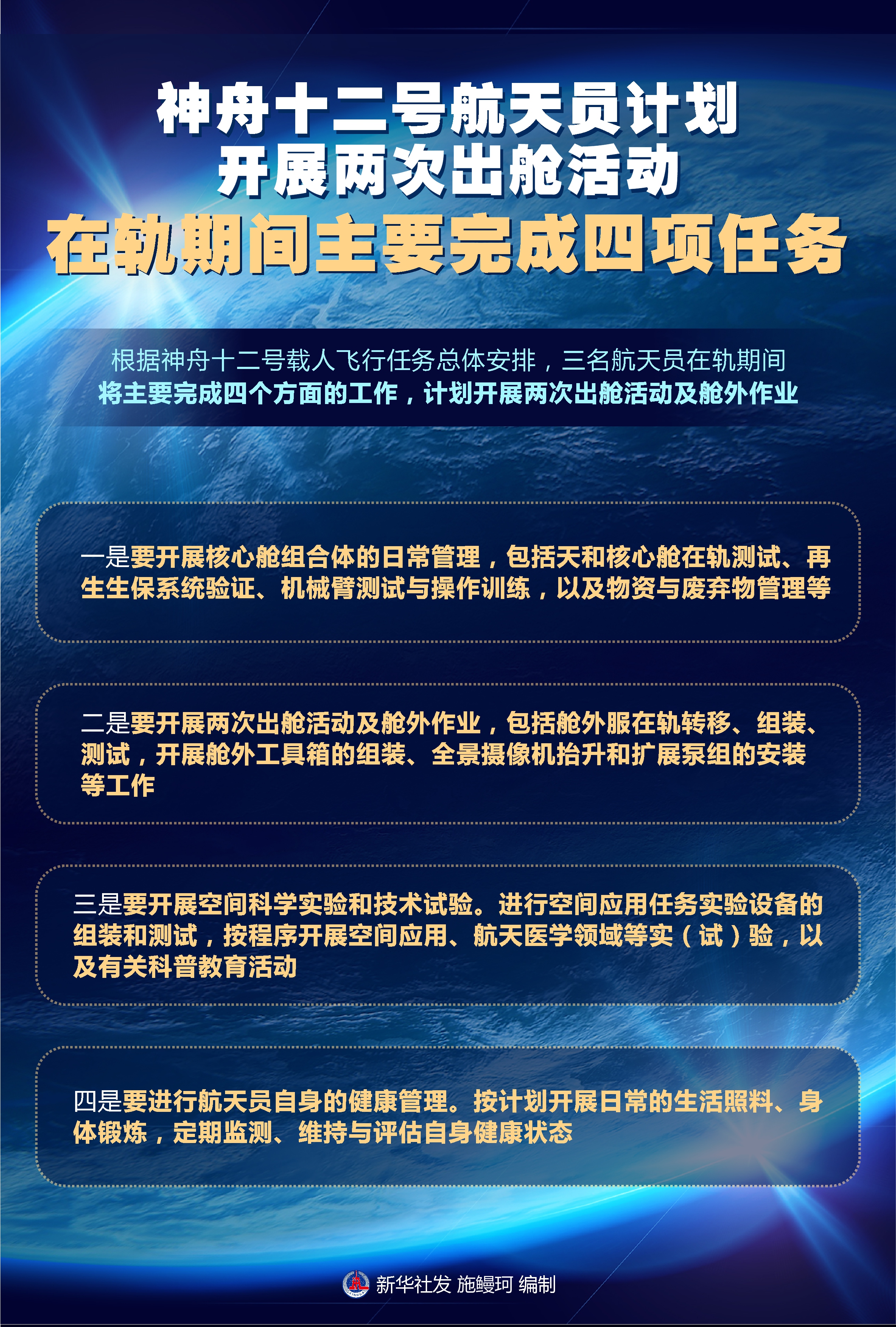 圖表:神舟十二號航天員計劃開展兩次出艙活動 在軌期間主要完成四項任務(wù)
