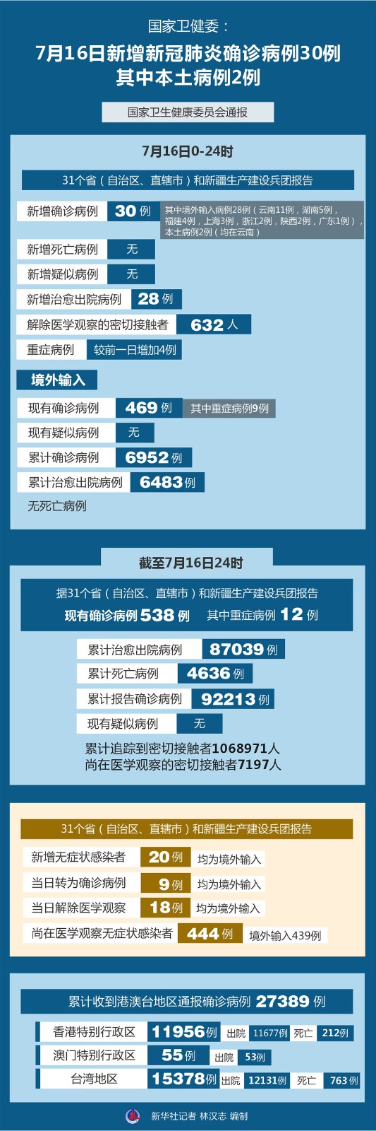 圖表:國家衛(wèi)健委:7月16日新增新冠肺炎確診病例30例 其中本土病例2例