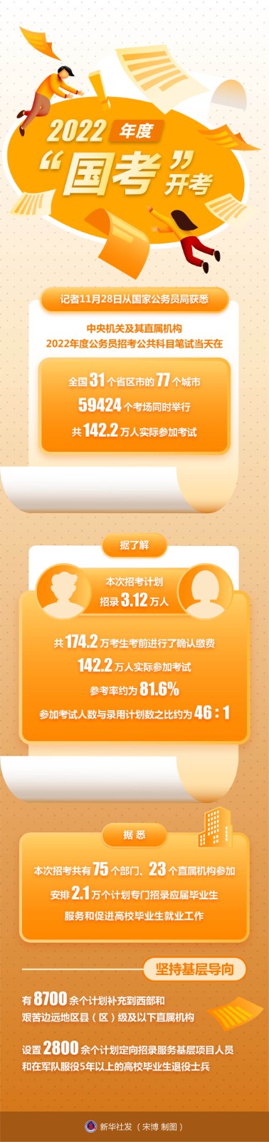 記者11月28日從國家公務員局獲悉,中央機關(guān)及其直屬機構(gòu)2022年度公務員招考公共科目筆試當天在全國31個省區(qū)市的77個城市、59424個考場同時舉行,共142.2萬人實際參加考試。