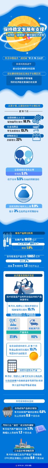 11月中國(guó)經(jīng)濟(jì)“成績(jī)單”12月15日出爐,多重風(fēng)險(xiǎn)挑戰(zhàn)下,部分指標(biāo)增速有所回落,但主要宏觀指標(biāo)總體處于合理區(qū)間,發(fā)展韌性不斷增強(qiáng),保持經(jīng)濟(jì)穩(wěn)定發(fā)展仍有支撐。