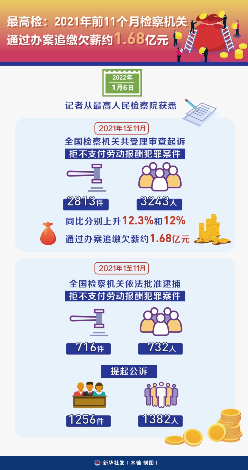 圖表:最高檢:2021年前11個月檢察機關(guān)通過辦案追繳欠薪約1.68億元