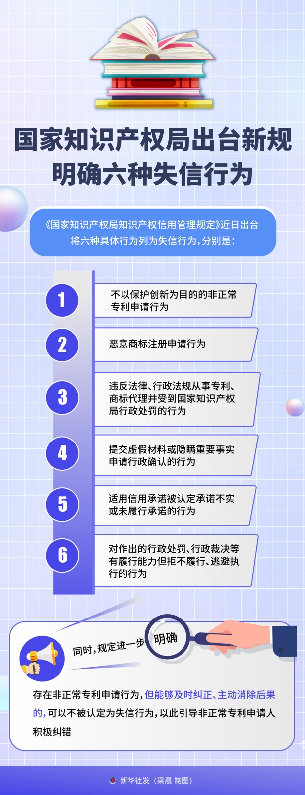 《國家知識產(chǎn)權(quán)局知識產(chǎn)權(quán)信用管理規(guī)定》近日出臺,將六種具體行為列為失信行為,分別是:不以保護創(chuàng)新為目的的非正常專利申請行為,惡意商標(biāo)注冊申請行為,違反法律、行政法規(guī)從事專利、商標(biāo)代理并受到國家知識產(chǎn)權(quán)局行政處罰的行為,提交虛假材料或隱瞞重要事實申請行政確認的行為,適用信用承諾被認定承諾不實或未履行承諾的行為,對作出的行政處罰、行政裁決等有履行能力但拒不履行、逃避執(zhí)行的行為。