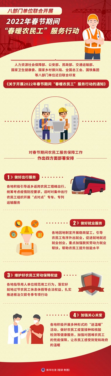 人力資源社會(huì)保障部、公安部、民政部、交通運(yùn)輸部、國家衛(wèi)生健康委、國家鄉(xiāng)村振興局、全國總工會(huì)、國鐵集團(tuán)等八部門單位近日聯(lián)合印發(fā)《關(guān)于開展2022年春節(jié)期間“春暖農(nóng)民工”服務(wù)行動(dòng)的通知》,對(duì)春節(jié)期間農(nóng)民工服務(wù)保障工作作出四方面部署安排。