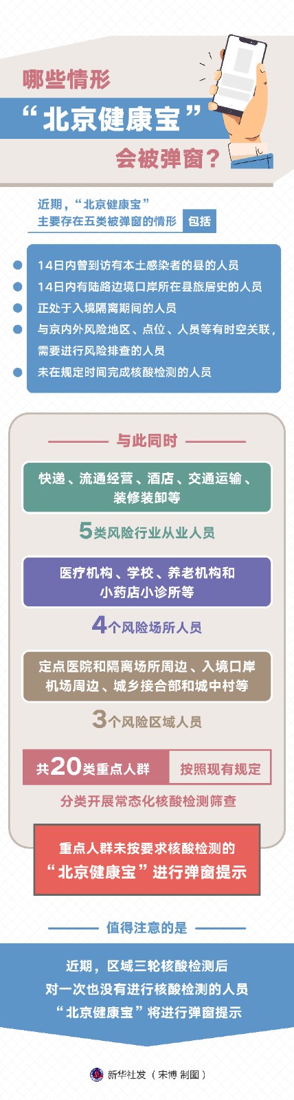 近期,“北京健康寶”主要存在五類(lèi)被彈窗的情形,包括14日內(nèi)曾到訪有本土感染者的縣的人員;14日內(nèi)有陸路邊境口岸所在縣旅居史的人員;正處于入境隔離期間的人員;與京內(nèi)外風(fēng)險(xiǎn)地區(qū)、點(diǎn)位、人員等有時(shí)空關(guān)聯(lián),需要進(jìn)行風(fēng)險(xiǎn)排查的人員;未在規(guī)定時(shí)間完成核酸檢測(cè)的人員。