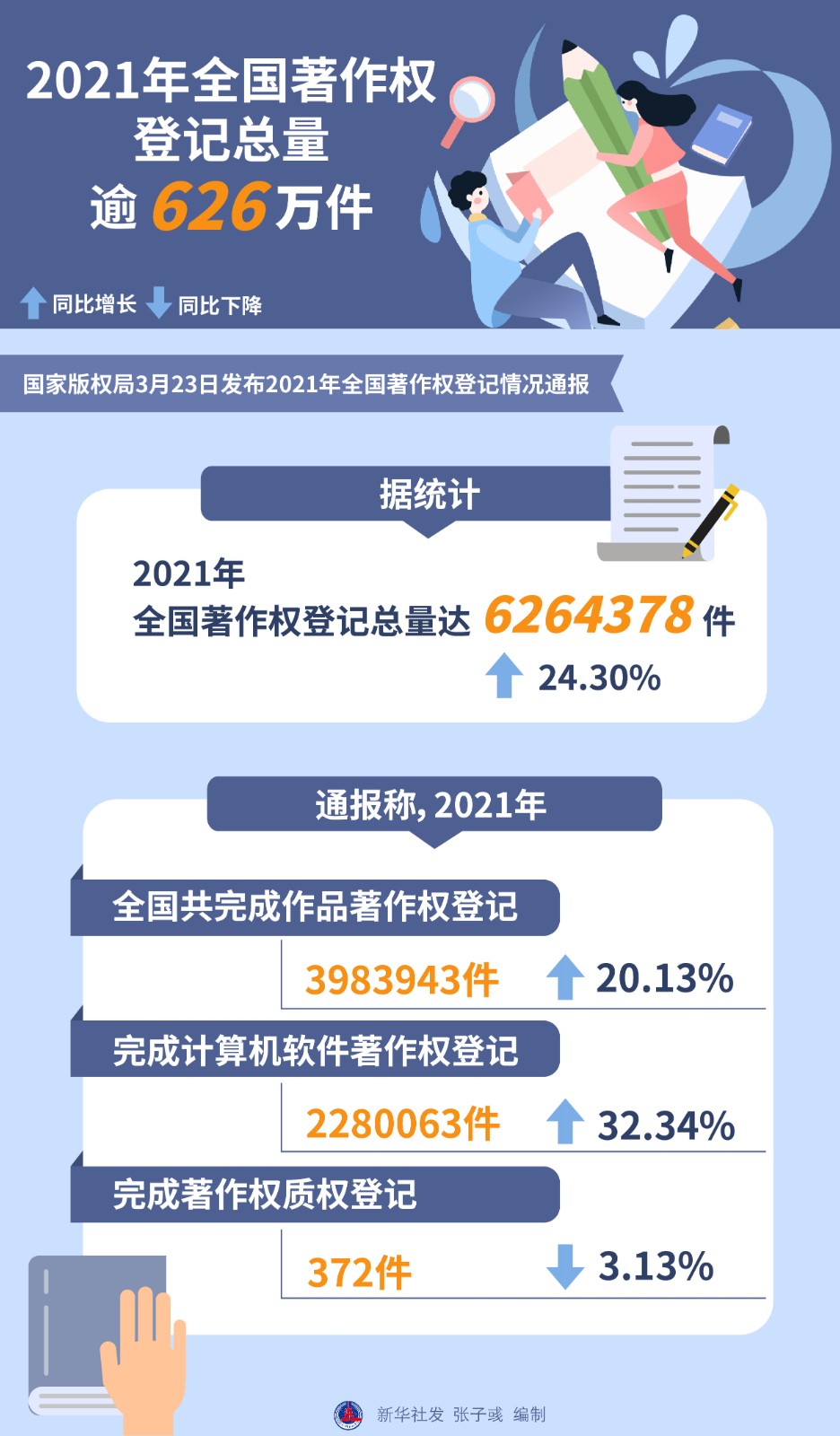 國家版權(quán)局3月23日發(fā)布2021年全國著作權(quán)登記情況通報(bào)。據(jù)統(tǒng)計(jì),2021年全國著作權(quán)登記總量達(dá)6264378件,同比增長24.30%。