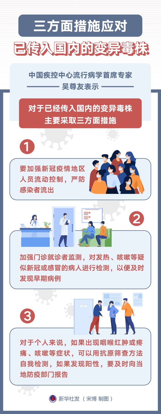 中國疾控中心流行病學首席專家吳尊友表示,對于已經(jīng)傳入國內(nèi)的變異毒株,主要采取三方面措施。