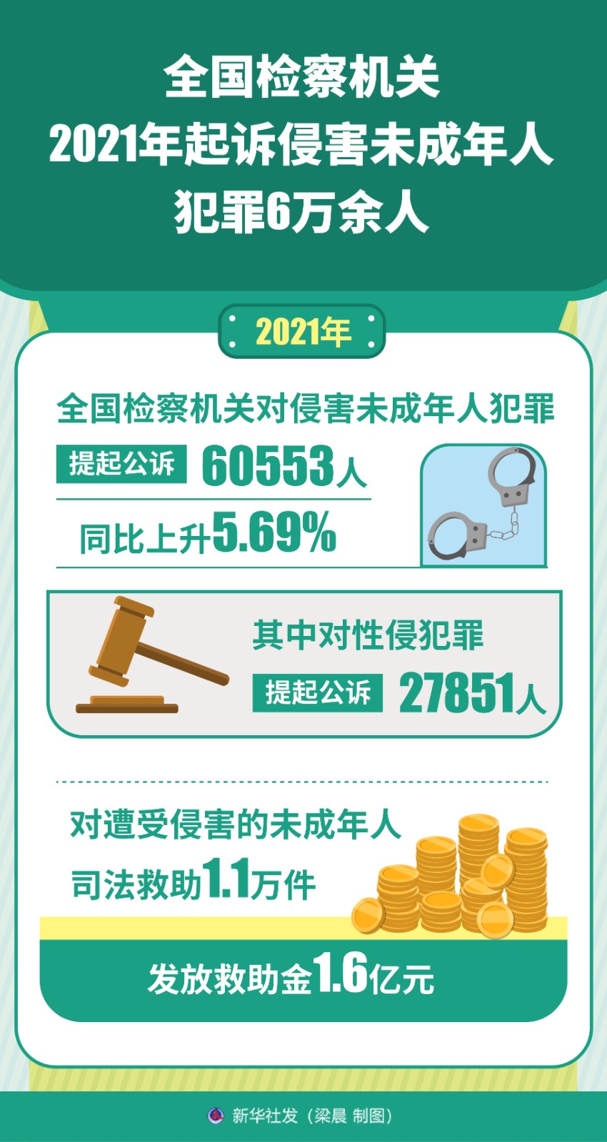 2021年對遭受侵害的未成年人司法救助1.1萬件、發(fā)放救助金1.6億元。