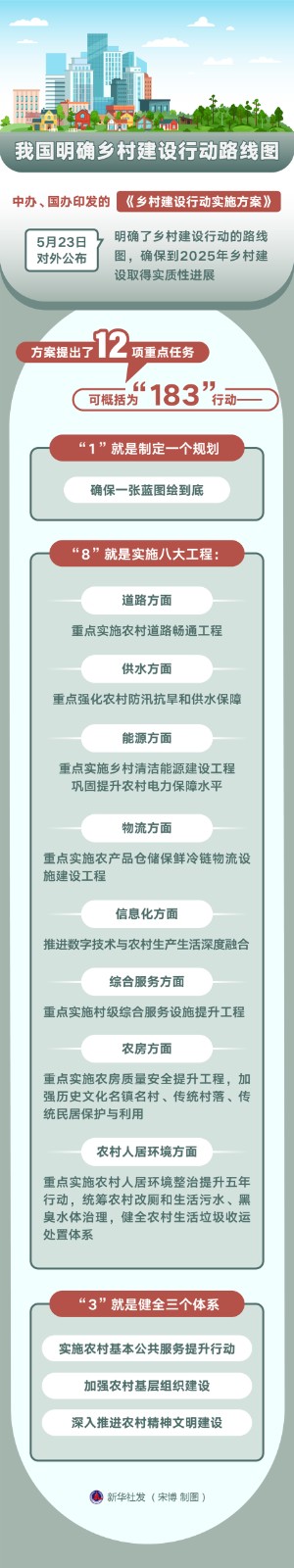 中辦、國辦印發(fā)的《鄉(xiāng)村建設行動實施方案》5月23日對外公布,明確了鄉(xiāng)村建設行動的路線圖,確保到2025年鄉(xiāng)村建設取得實質性進展,農村人居環(huán)境持續(xù)改善,農村公共基礎設施往村覆蓋、往戶延伸取得積極進展,農村基本公共服務水平穩(wěn)步提升,農村精神文明建設顯著加強。