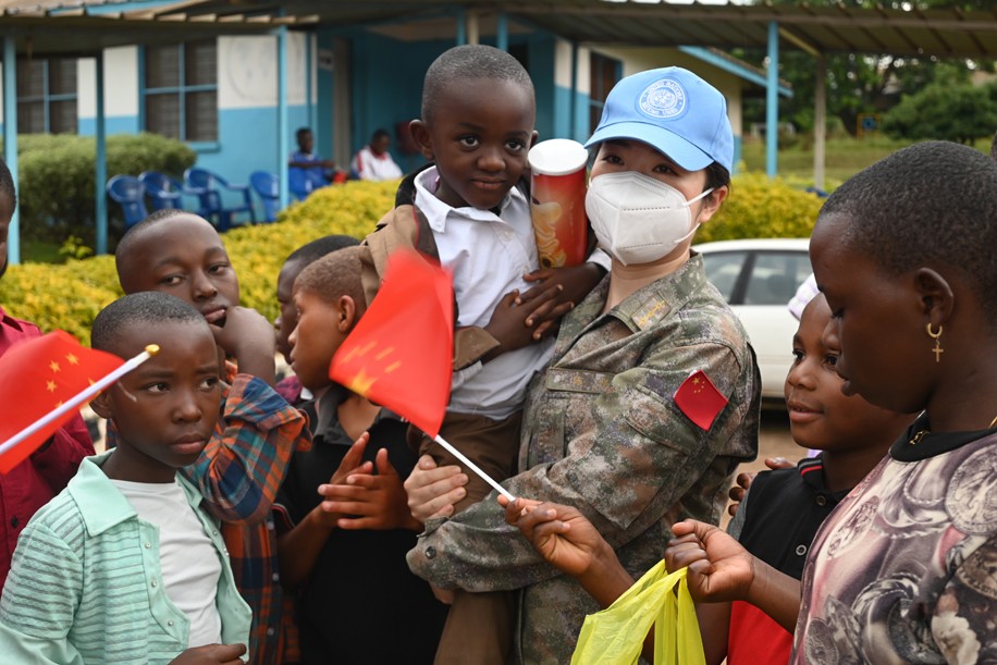 5月26日,在剛果(金)布卡武市國際SOS兒童村,中國第25批赴剛果(金)維和醫(yī)療分隊隊員開展愛心傳遞活動。