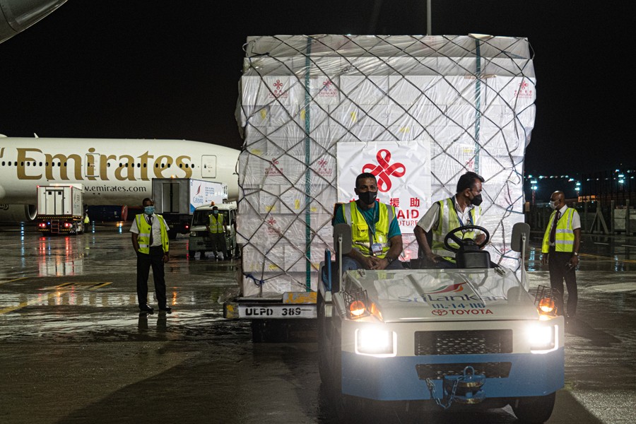 6月3日,在斯里蘭卡科倫坡班達(dá)拉奈克國際機(jī)場,工作人員搬運(yùn)中國援助的緊急人道主義藥品。
