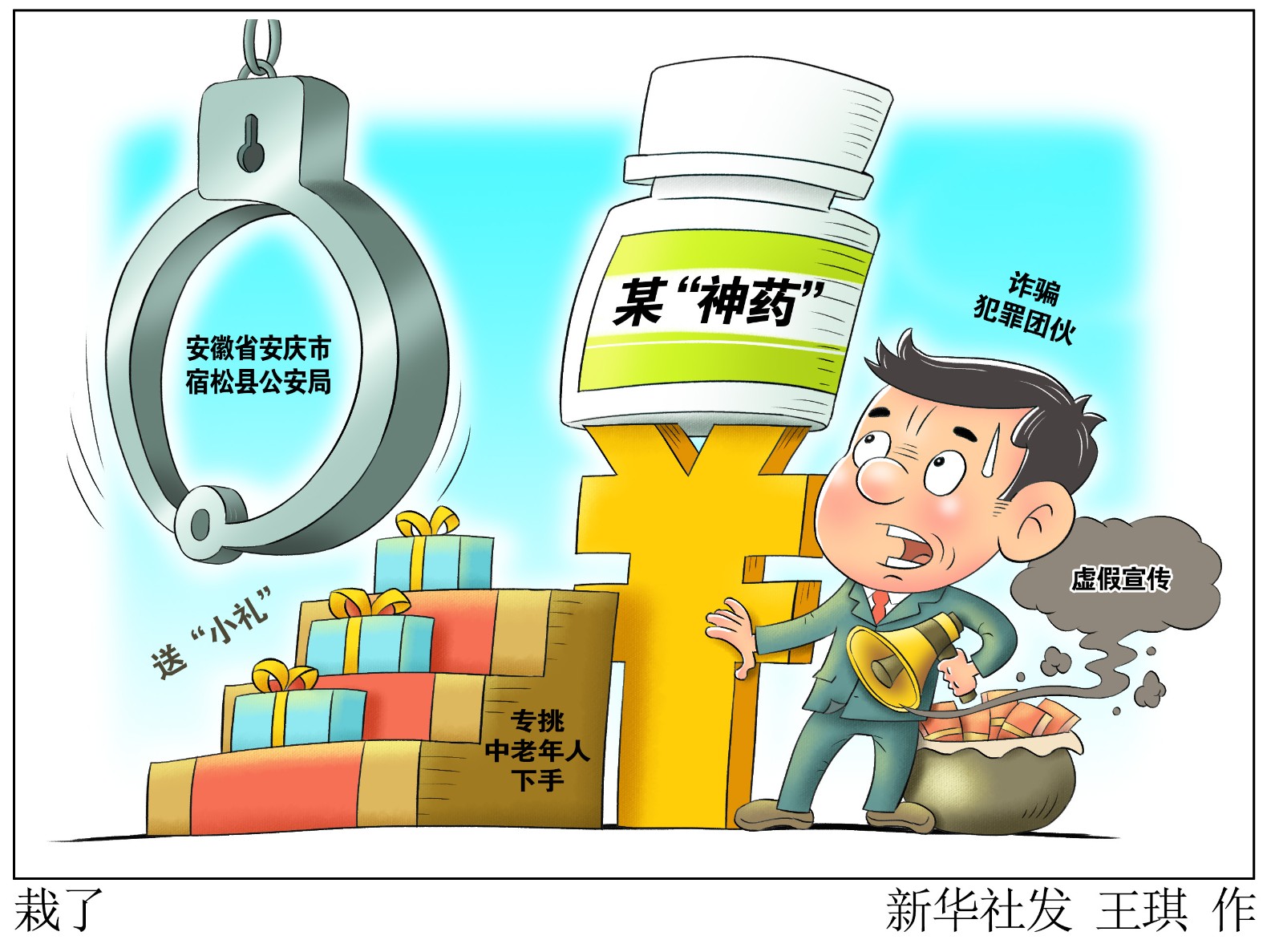 評書機、老人鞋等“小禮”請先笑納,“包治百病”的“神藥”快來試試?小心“騙你沒商量”!記者日前從安徽省安慶市宿松縣公安局了解到,當(dāng)?shù)鼐酱虻粢粋€向中老年群體虛假宣傳兜售藥品進行詐騙的犯罪團伙,全國多地數(shù)千人上當(dāng),涉案金額近千萬元。