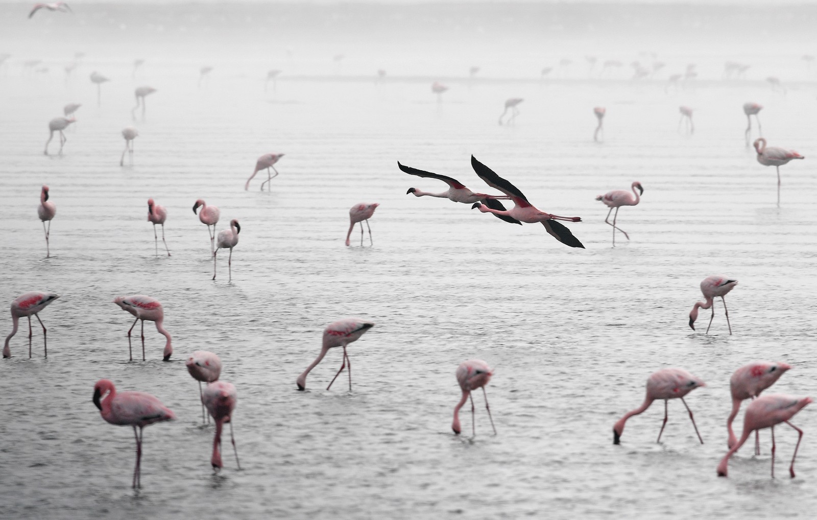 這是6月5日在納米比亞沃爾維斯灣拍攝的火烈鳥(niǎo)。