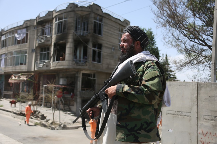 6月18日,安全人員在阿富汗喀布爾的襲擊現(xiàn)場(chǎng)附近警戒。