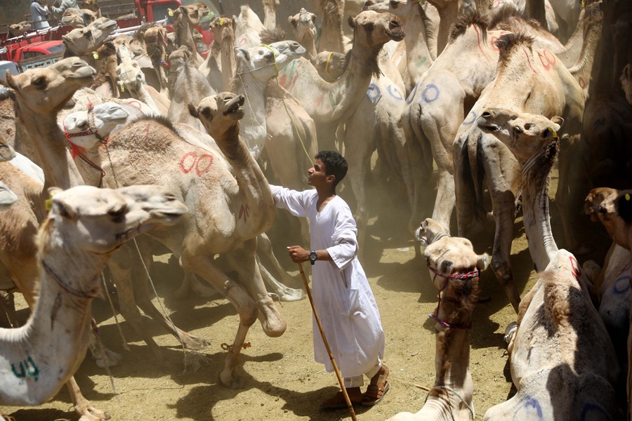 6月10日,商販在埃及開羅附近的一處駱駝市場等待顧客。