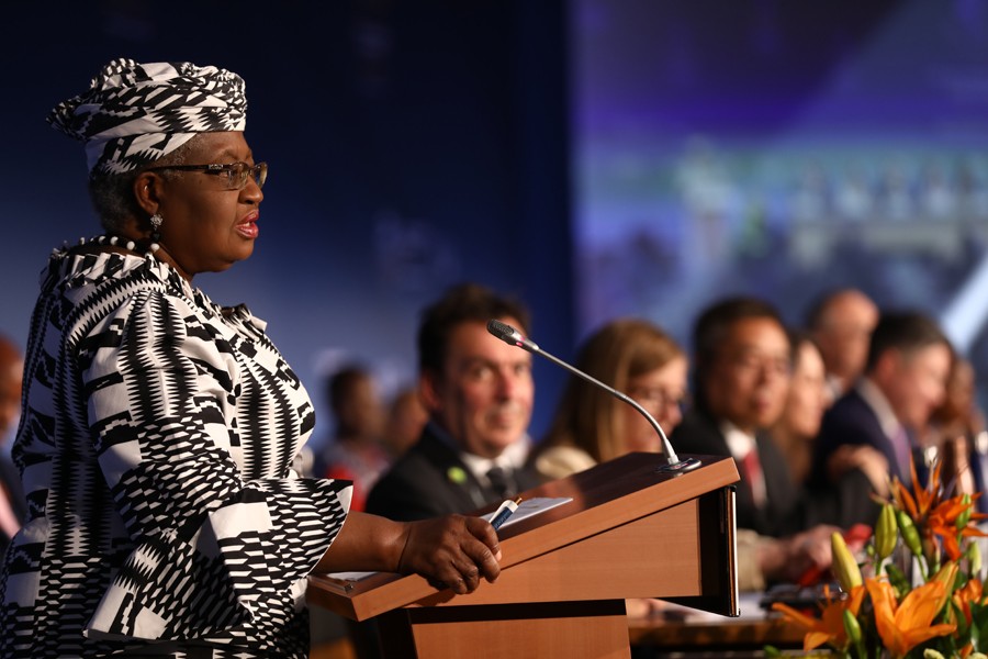 6月12日,世界貿易組織總干事伊維拉(前)在瑞士日內瓦舉行的世貿組織第12屆部長級會議開幕式上致辭。