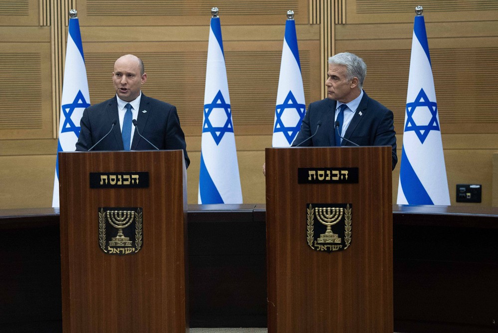6月20日,以色列總理貝內(nèi)特(左)與候任總理、外長(zhǎng)拉皮德在耶路撒冷共同發(fā)表講話。