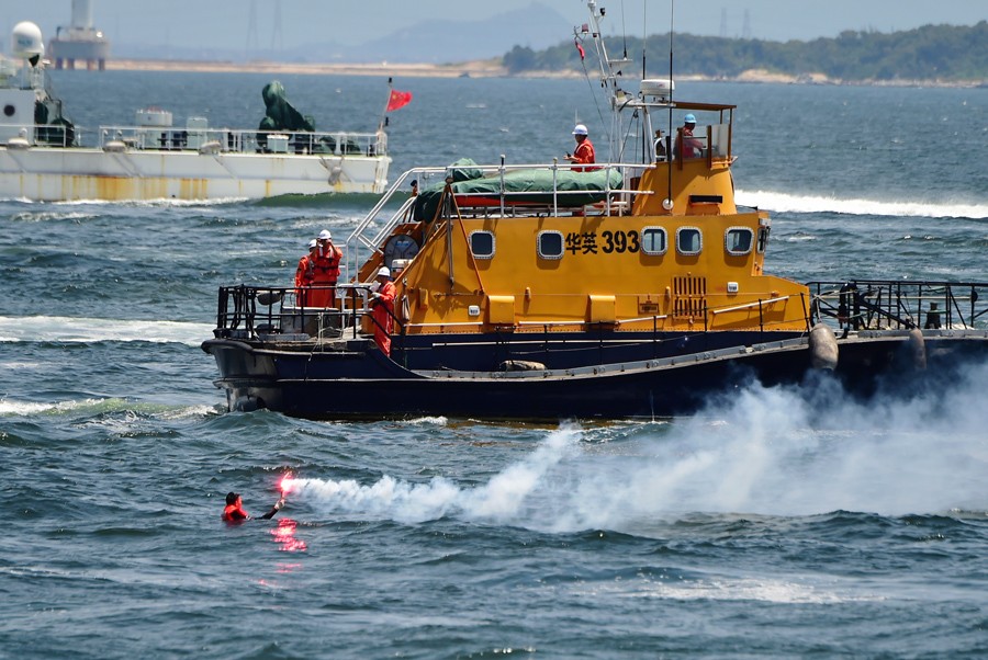 6月28日,參加演練的“華英393”救助艇準(zhǔn)備救助“落水”船員。