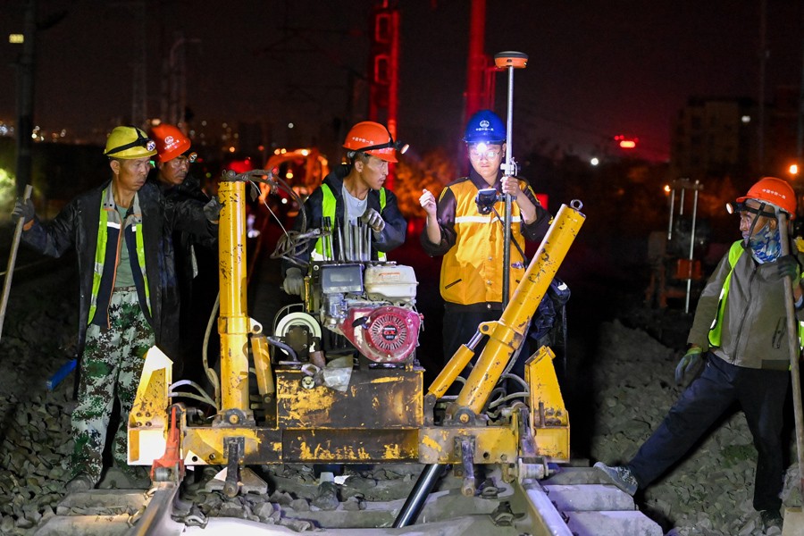 6月29日,在烏將鐵路地窩鋪車站擴(kuò)能改造施工現(xiàn)場,中鐵一局的施工人員進(jìn)行起道作業(yè)。