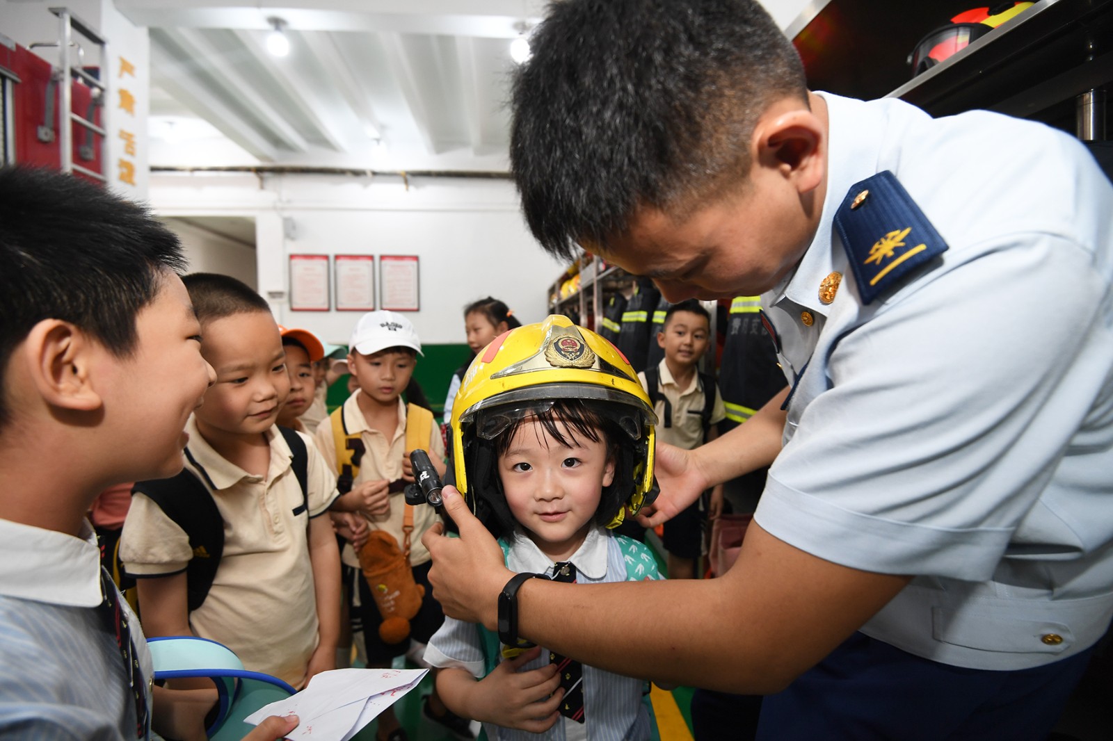6月30日,貴州省貴陽(yáng)市第十一幼兒園的小朋友在貴陽(yáng)市南明區(qū)消防救援大隊(duì)體驗(yàn)消防救援頭盔。