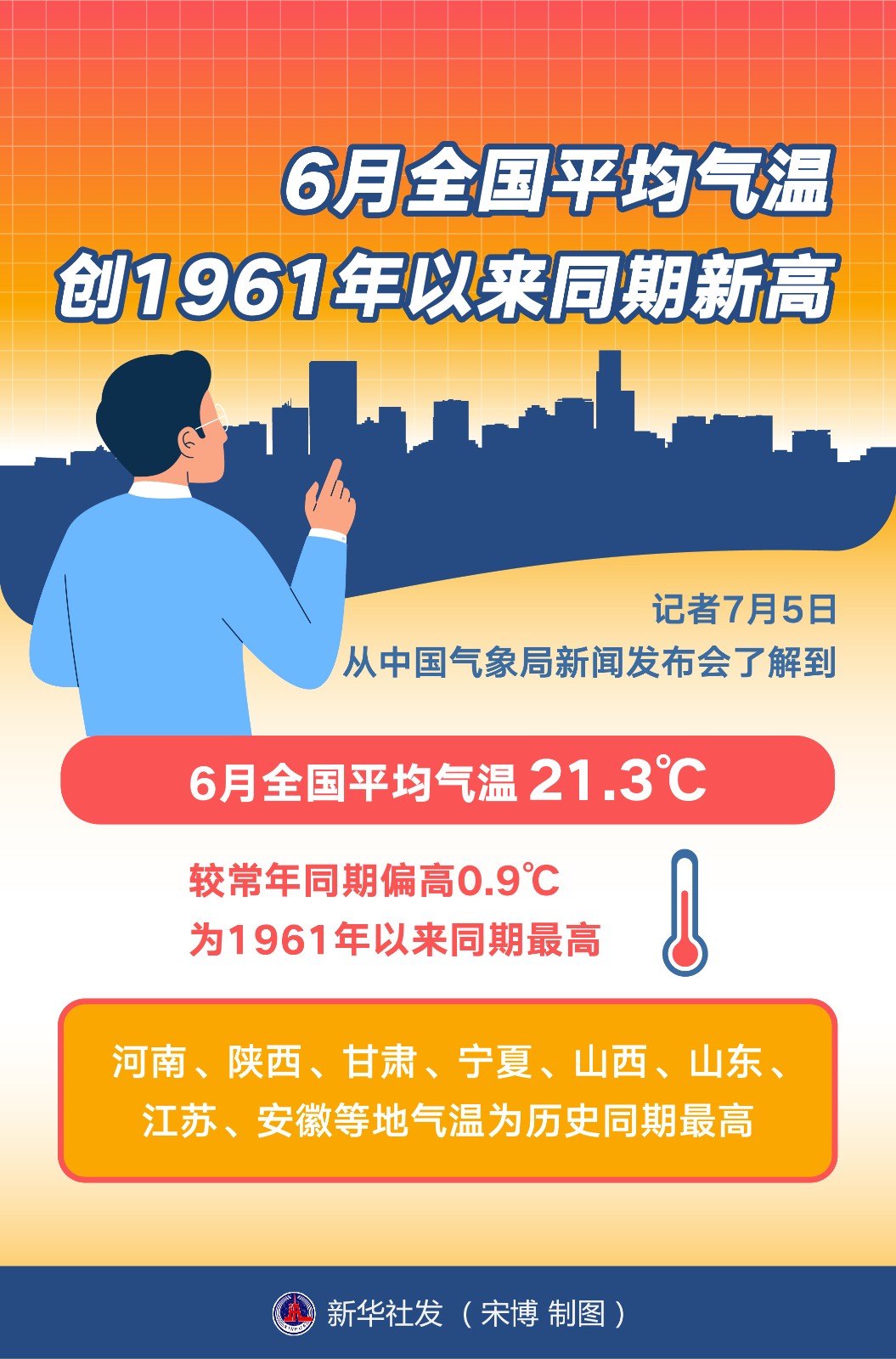 記者7月5日從中國(guó)氣象局新聞發(fā)布會(huì)了解到,6月全國(guó)平均氣溫21.3℃,較常年同期偏高0.9℃,為1961年以來(lái)同期最高。
