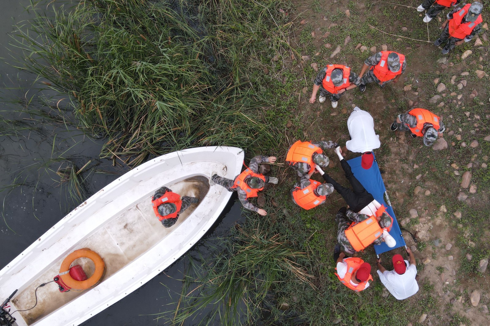 7月5日,在河北省沙河市十里亭鎮(zhèn)下解村舉行的防汛演練中,參演人員在演練營(yíng)救“落水群眾”(無(wú)人機(jī)照片)。