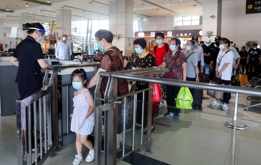 7月5日,在上海長途客運(yùn)南站,旅客在檢票口檢票乘車。