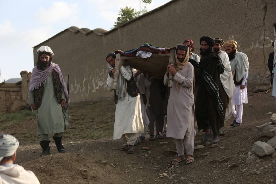 6月23日,在阿富汗帕克提卡省一座村莊,人們轉(zhuǎn)移地震遇難者的遺體。