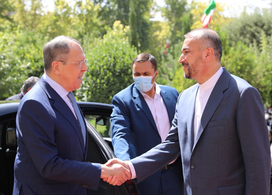6月23日,伊朗外長阿卜杜拉希揚(右)在德黑蘭迎接俄羅斯外長拉夫羅夫。