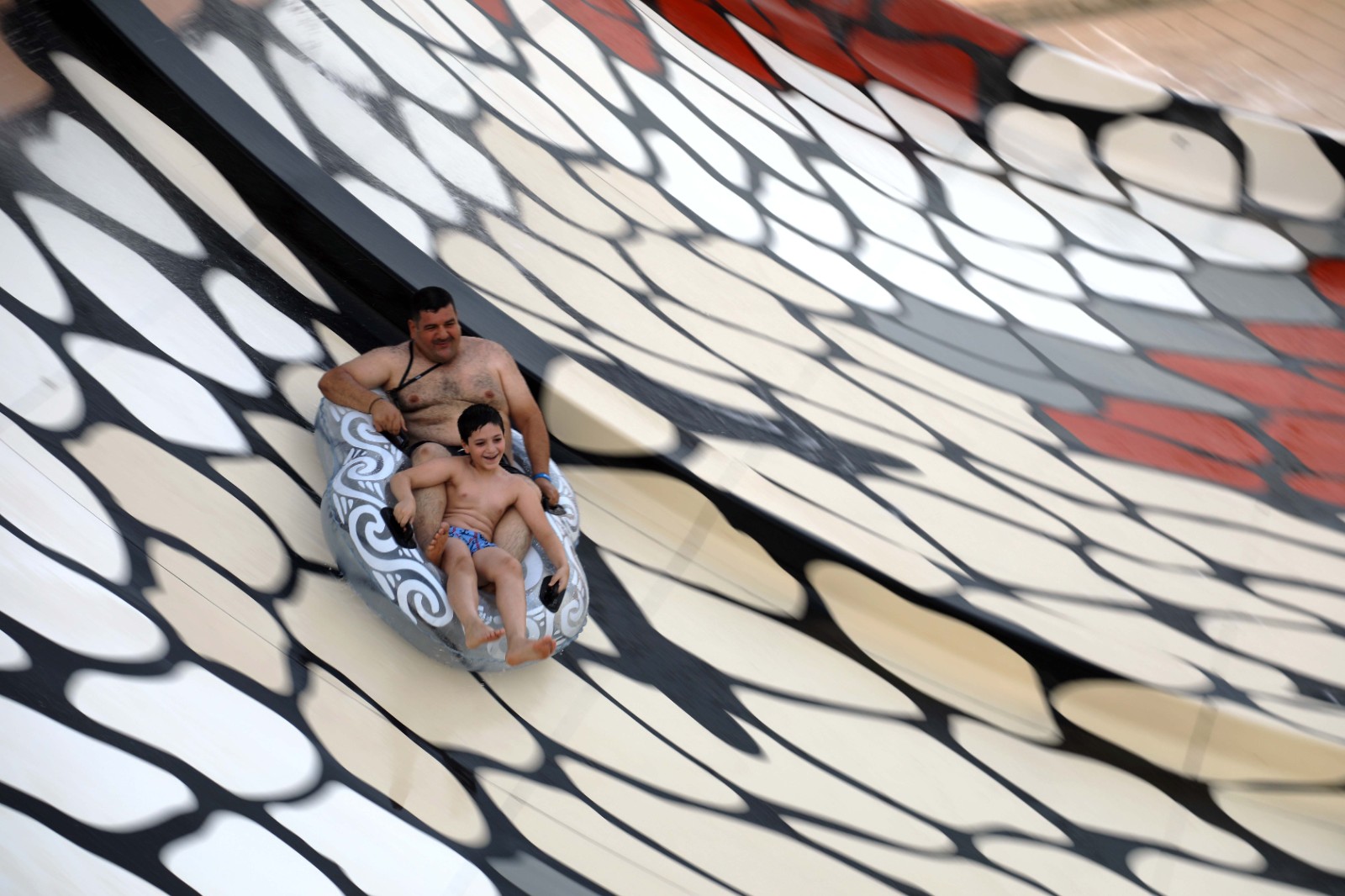 6月20日,一對父子在伊拉克巴格達(dá)的一處泳池休閑消夏。