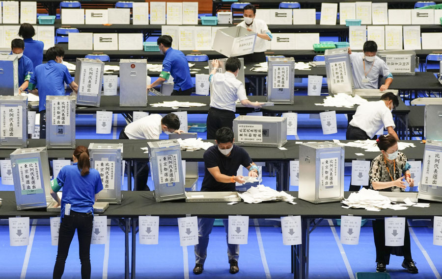 7月10日,工作人員在日本東京港區(qū)體育中心進(jìn)行參議院選舉投票開(kāi)票作業(yè)。
