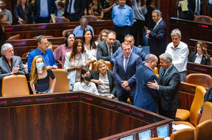 6月30日,在位于耶路撒冷的以色列議會,貝內(nèi)特(前右二)和拉皮德(前右一)參加議會全會。