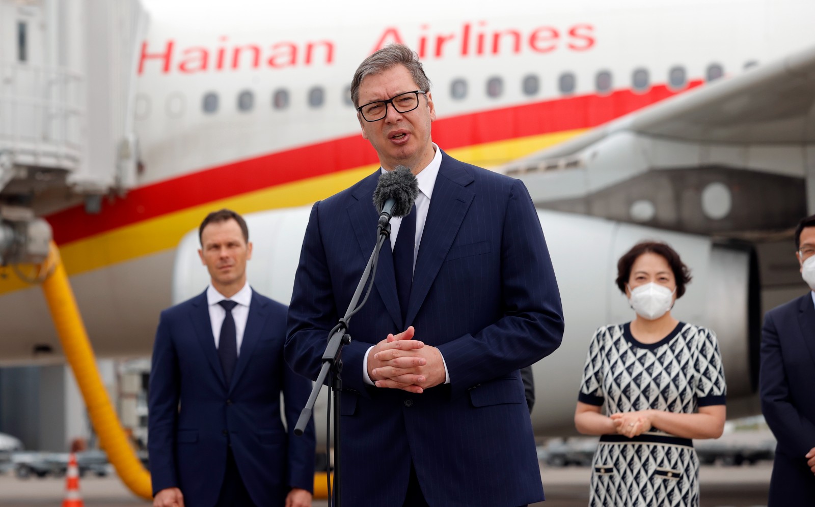 7月16日,在塞爾維亞貝爾格萊德機(jī)場(chǎng),塞爾維亞總統(tǒng)武契奇在歡迎儀式上致辭。
