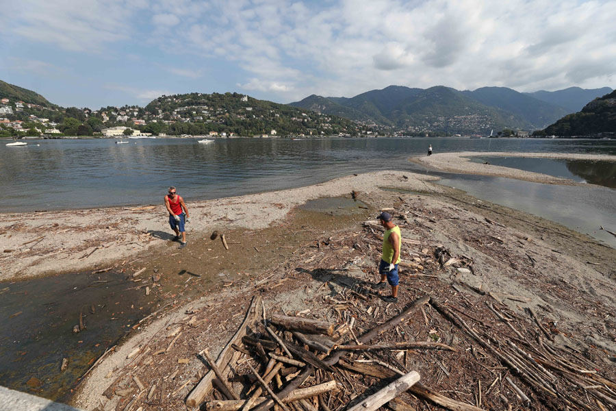 這是7月13日在意大利倫巴第大區(qū)科莫拍攝的遭遇干旱的科莫湖。