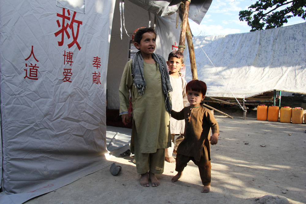 7月18日,在阿富汗地震重災(zāi)區(qū)帕克提卡省齊魯克區(qū),孩子們站在中國紅十字會援助的救災(zāi)帳篷外。