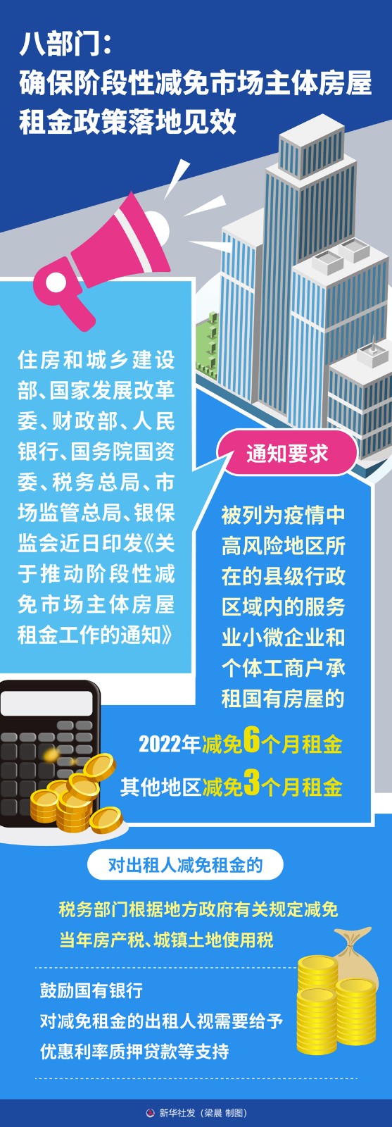 住房和城鄉(xiāng)建設(shè)部、國(guó)家發(fā)展改革委、財(cái)政部、人民銀行、國(guó)務(wù)院國(guó)資委、稅務(wù)總局、市場(chǎng)監(jiān)管總局、銀保監(jiān)會(huì)近日印發(fā)《關(guān)于推動(dòng)階段性減免市場(chǎng)主體房屋租金工作的通知》,要求各地結(jié)合自身實(shí)際,統(tǒng)籌各類資金,拿出務(wù)實(shí)管用措施推動(dòng)減免市場(chǎng)主體房屋租金,確保各項(xiàng)政策措施落地生效。