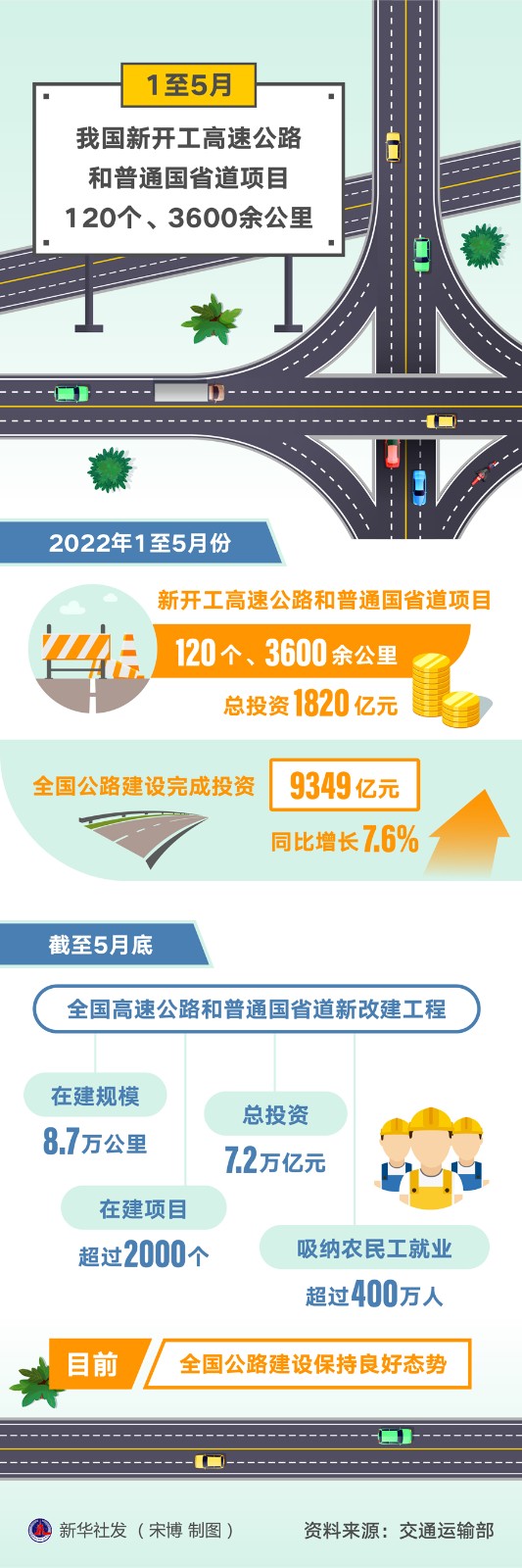 在6月27日舉行的國新辦發(fā)布會上,趙沖久表示,1至5月,全國公路建設(shè)完成投資9349億元,同比增長7.6%。截至5月底,全國高速公路和普通國省道新改建工程在建規(guī)模8.7萬公里,在建項目超過2000個,總投資7.2萬億元,吸納農(nóng)民工就業(yè)超過400萬人。“目前,全國公路建設(shè)保持良好態(tài)勢?!?/p>