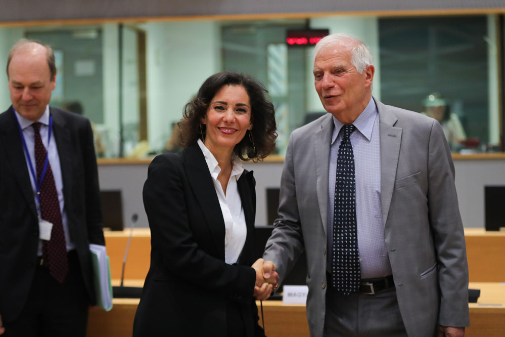 7月18日,在比利時(shí)布魯塞爾,歐盟外交與安全政策高級(jí)代表博雷利(右)與比利時(shí)外交大臣拉比卜在會(huì)前握手。