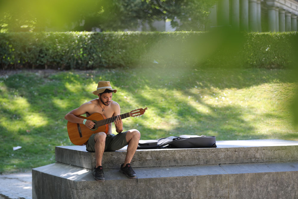 7月19日,一名男子在比利時布魯塞爾五十周年紀(jì)念公園的樹蔭下彈吉他。