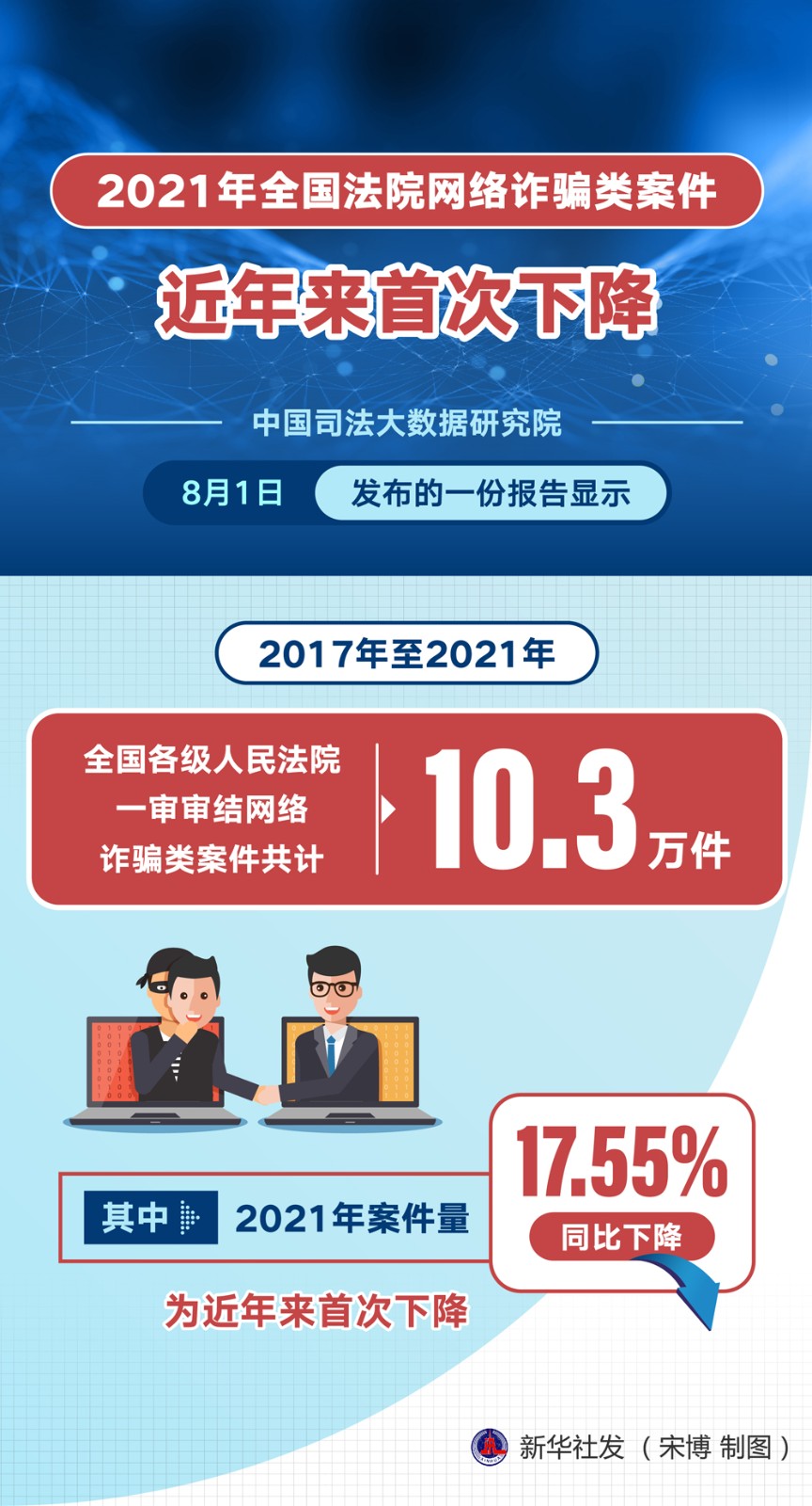 中國司法大數(shù)據(jù)研究院8月1日發(fā)布的一份報(bào)告顯示,2017年至2021年全國各級(jí)人民法院一審審結(jié)網(wǎng)絡(luò)詐騙類案件共計(jì)10.3萬件,其中2021年案件量同比下降17.55%,為近年來首次下降。