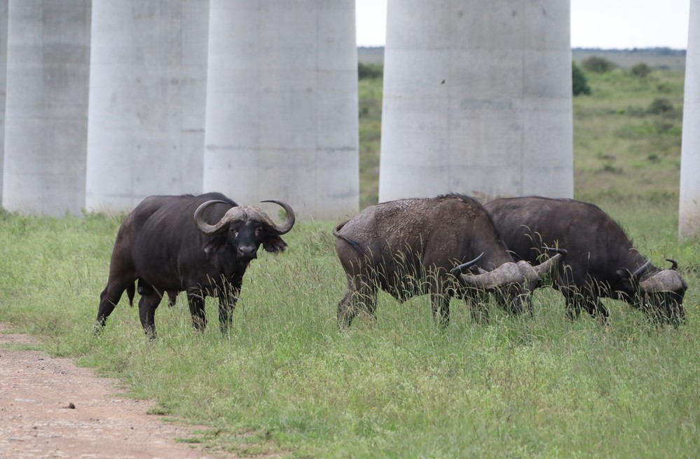幾頭水牛在肯尼亞內(nèi)羅畢國家公園特大橋下吃草(2021年5月19日攝)。