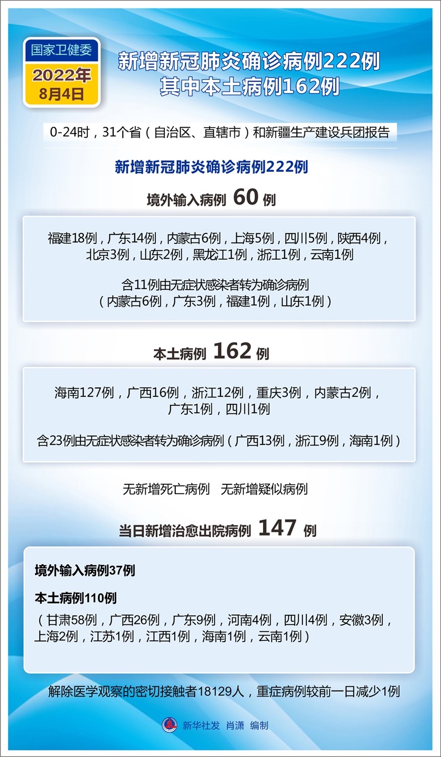 (圖表)國家衛(wèi)健委:8月4日新增新冠肺炎確診病例222例 其中本土病例162例