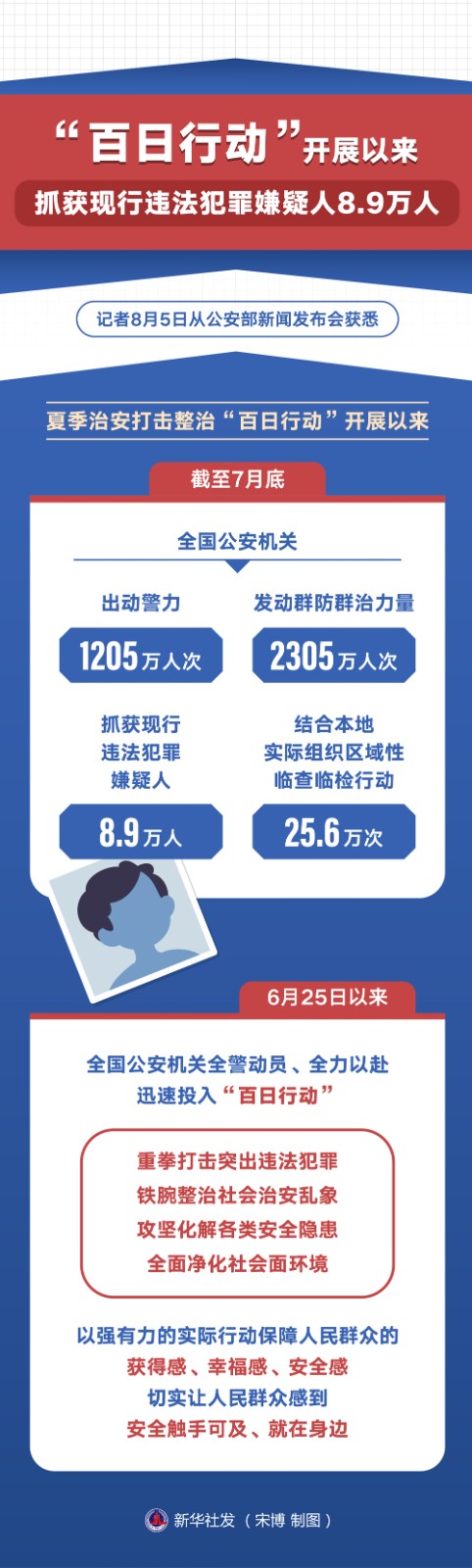 記者8月5日從公安部新聞發(fā)布會獲悉,夏季治安打擊整治“百日行動”開展以來,截至7月底,全國公安機關(guān)出動警力1205萬人次,發(fā)動群防群治力量2305萬人次,抓獲現(xiàn)行違法犯罪嫌疑人8.9萬人,結(jié)合本地實際組織區(qū)域性臨查臨檢行動25.6萬次。