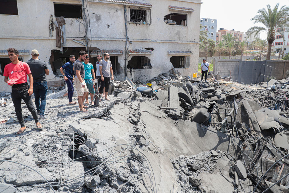 8月6日,人們?cè)诩由吵遣榭纯找u后的廢墟。