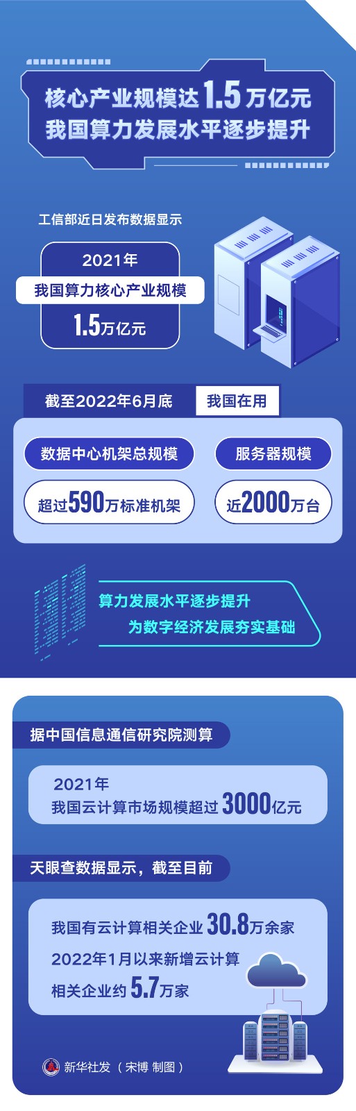 工信部近日發(fā)布數(shù)據(jù)顯示,2021年,我國算力核心產(chǎn)業(yè)規(guī)模達(dá)1.5萬億元。截至2022年6月底,我國在用數(shù)據(jù)中心機(jī)架總規(guī)模超過590萬標(biāo)準(zhǔn)機(jī)架,服務(wù)器規(guī)模近2000萬臺。算力發(fā)展水平逐步提升,為數(shù)字經(jīng)濟(jì)發(fā)展夯實基礎(chǔ)。