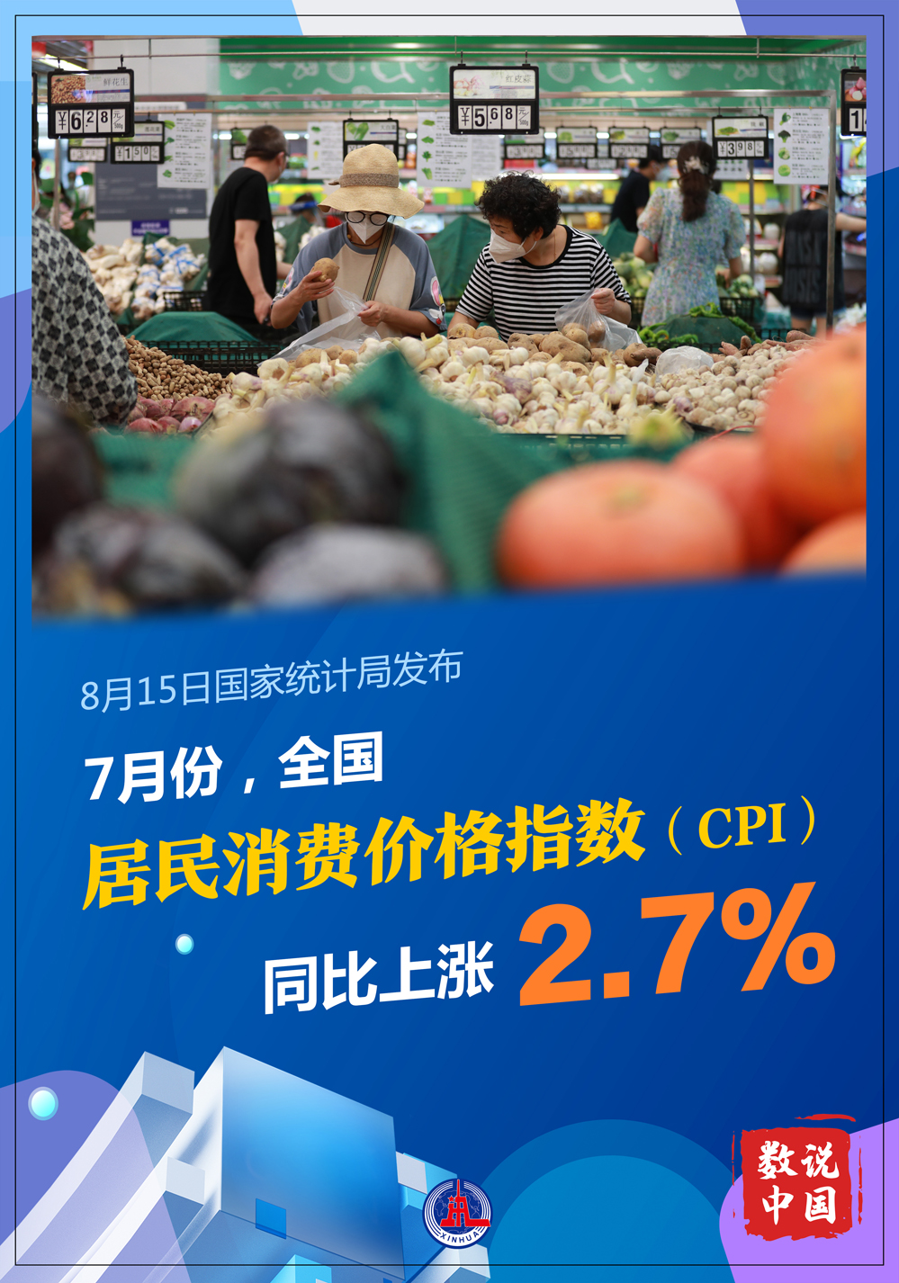 國家統(tǒng)計局8月15日發(fā)布數(shù)據(jù)顯示,7月份,全國居民消費價格指數(shù)(CPI)同比上漲2.7%,漲幅比上月擴大0.2個百分點。