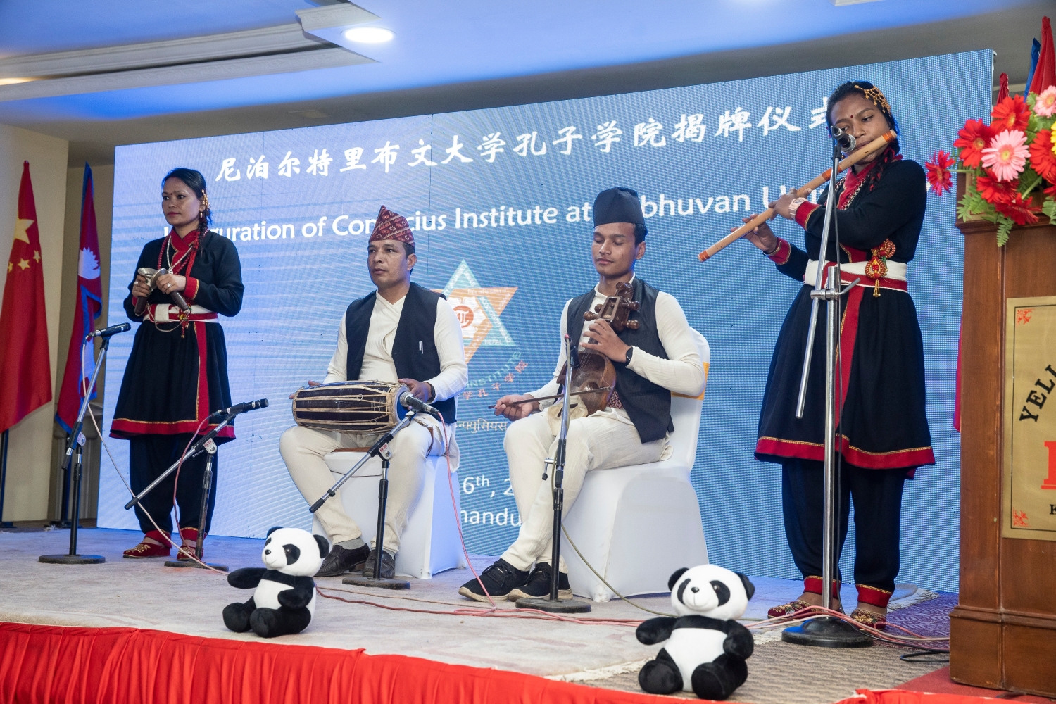 8月16日,表演者在尼泊爾加德滿都舉行的孔子學(xué)院揭牌儀式上演奏。