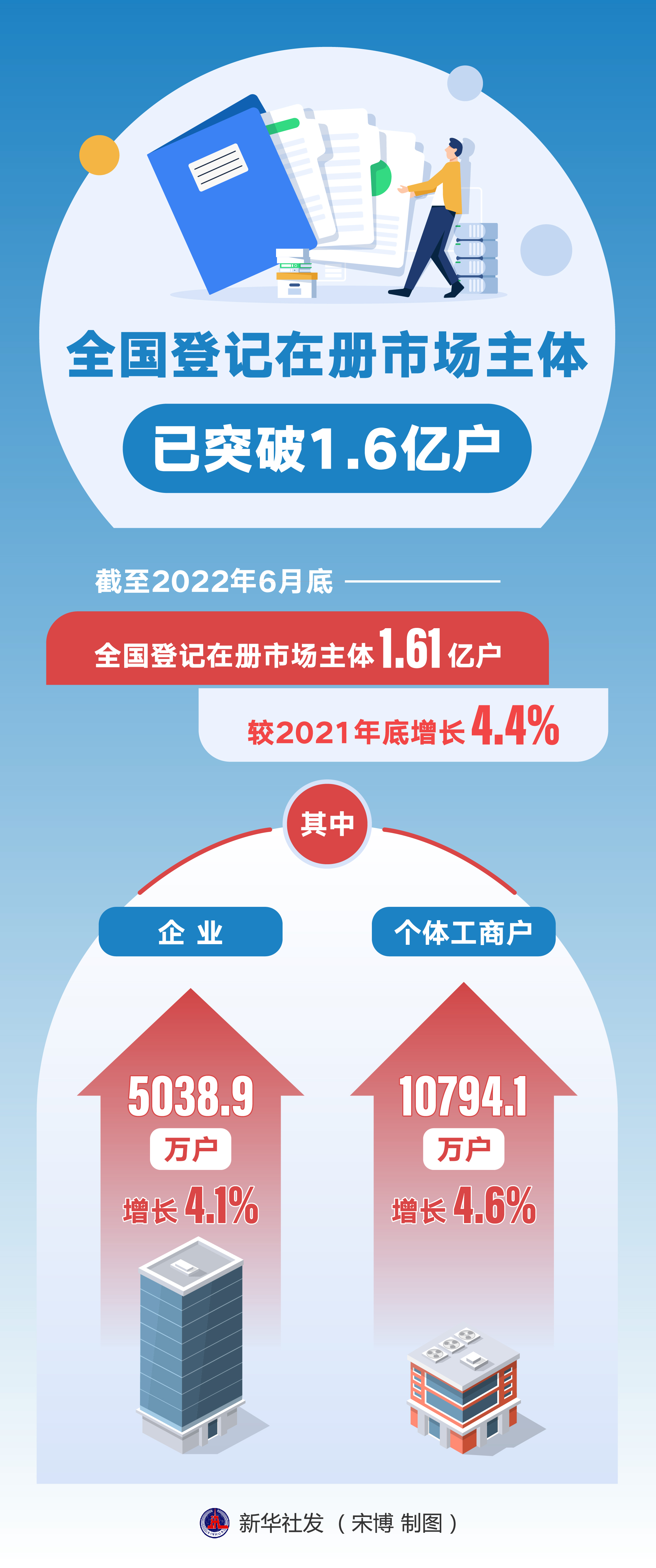 截至2022年6月底,全國登記在冊市場主體1.61億戶,較2021年底增長4.4%。其中企業(yè)5038.9萬戶,增長4.1%;個體工商戶10794.1萬戶,增長4.6%。