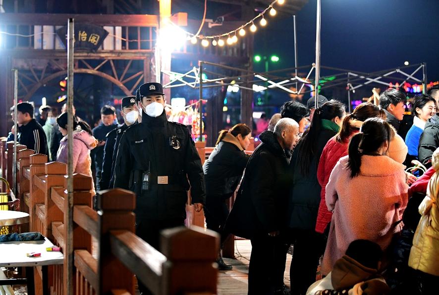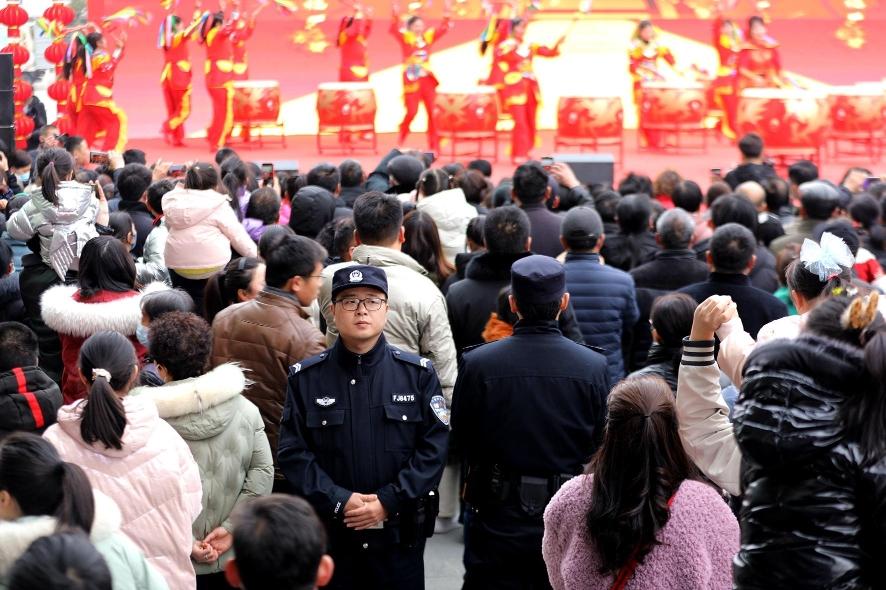 2月5日,安徽省舒城縣公安局城中派出所民輔警在傳統(tǒng)民俗表演活動現(xiàn)場巡邏守護(hù)。