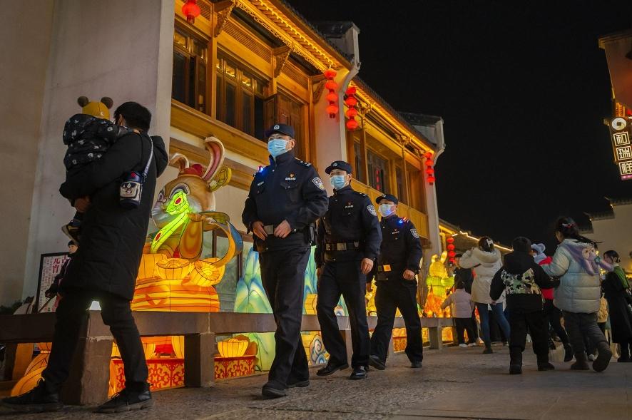2月4日晚,安徽省蕪湖市鏡湖分局民輔警在網(wǎng)紅打卡地古城景區(qū)巡邏執(zhí)勤,守護(hù)百姓平安。